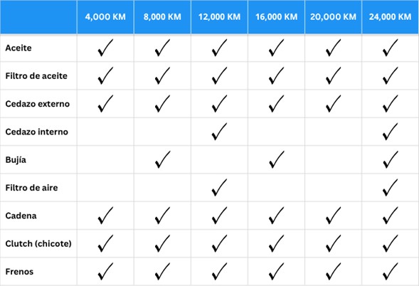 Cada modelo de motocicleta requiere servicio de afinación a distinto kilometraje. Los valores de esta tabla corresponden con estimaciones promedio.